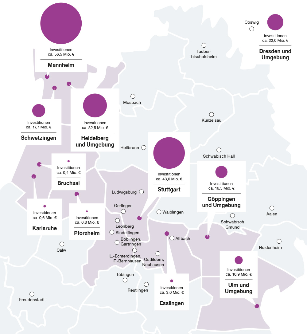 Zusätzlich sind für das Jahr 2020 die Baustarts für Neubauvorhaben in Dresden und Ulm vorgesehen. In Dresden sind am Käthe-Kollwitz-Ufer insgesamt 120 Wohnungen und zwei Gewerbeeinheiten geplant. In der Gneisenau- / Scharnhorststraße in Ulm beginnt der Bau von 38 Wohnungen und einer Gewerbeeinheit.