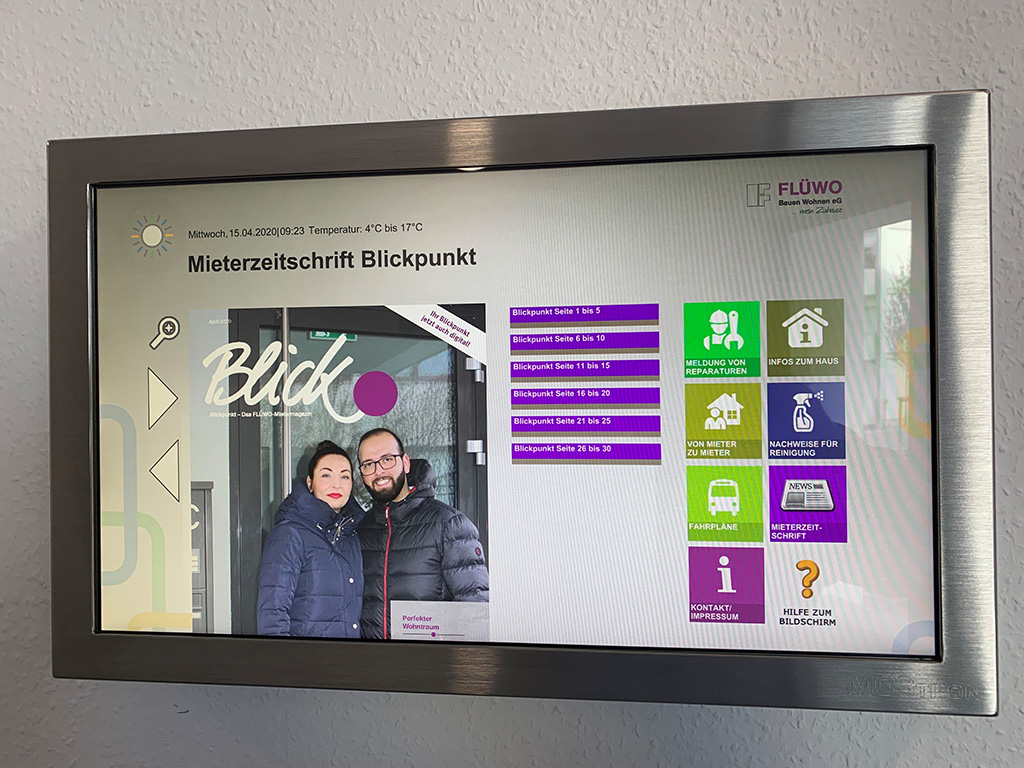 Digitale Infoboards in den Treppenhäusern ermöglichen einen schnellen und bidirektionalen Austausch zwischen den Mieterinnen und Mietern und der FLÜWO.
